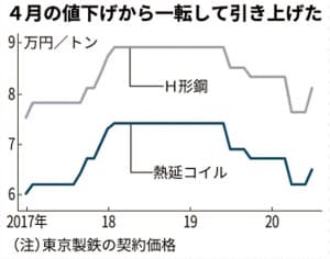 電炉大手の東京製鉄は16日、H形鋼や熱延コイルなど全ての鋼材を値上げすると発表した。全面値上げは2年半ぶり。原料高や国内外の経済活動の再始動が理由だ。ただコロナ禍で鋼材需要は停滞し、流通価格は下げ基調にある。異例のタイミングでの値上げは浸透に時間がかかりそうだ。