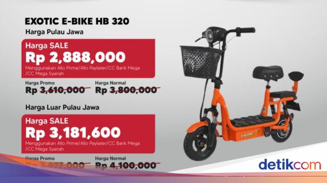 Untuk di luar Pulau Jawa, sepeda listrik tipe yang sama berlaku harga promo Rp 3.977.000/unit dari harga normal Rp 4.100.000/unit. Jika pembayaran menggunakan Allo Prime, kartu kredit Bank Mega atau Bank Mega Syariah, cukup membayar Rp 3.181.6000.